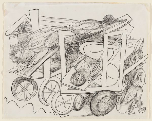 Curator: This is Max Beckmann’s "Dream of War" from the Harvard Art Museums, a stark pen and ink drawing. It really gets under your skin, doesn't it? Editor: Yes. The raw energy of that ink work is compelling, like a nightmare bleeding onto the page. It gives me the shivers. Curator: Beckmann, deeply affected by his experiences during World War I, frequently used the printmaking process to disseminate his critical perspective on the social conditions of his time. The sharp lines and simplified forms speak volumes about trauma. Editor: The disfigured body on the cart, the haunting figure below... It’s all so visceral. It's almost like a grotesque puppet show playing out the horrors of the battlefield. Curator: Exactly. It’s this potent combination of material rawness and sharp, unflinching imagery that makes it so resonant, even today. Editor: It’s a stark reminder of the human cost of conflict, rendered with brutal honesty. I'll certainly not forget this one soon.