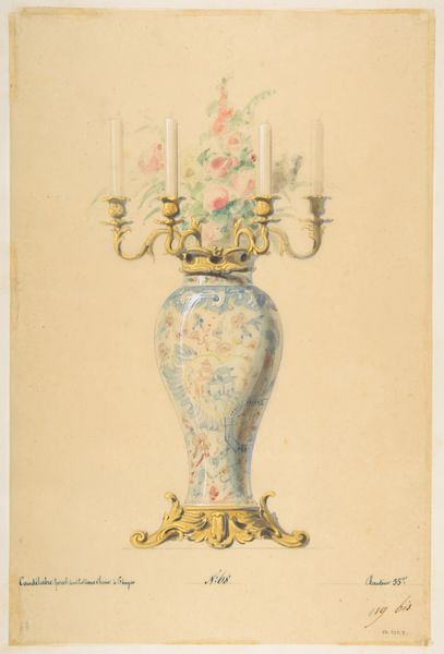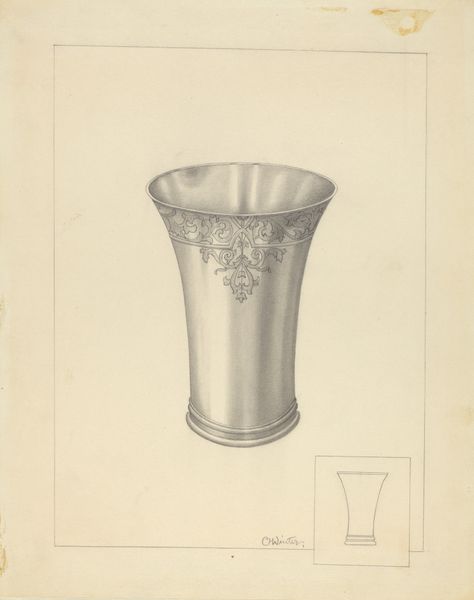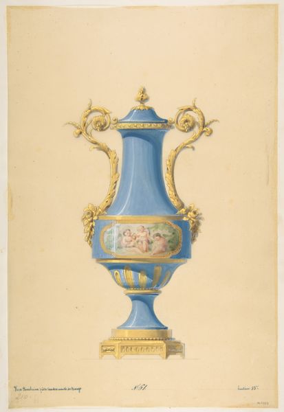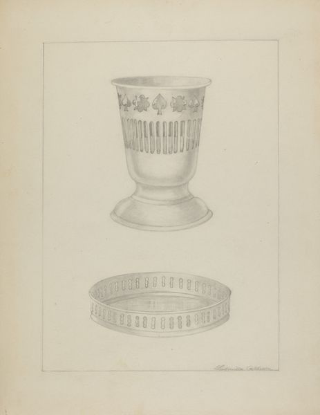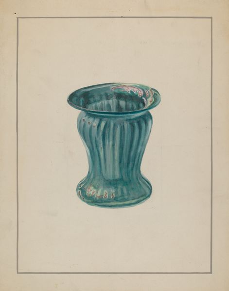 Editor: So, here we have Francis Law Durand’s "Fire Lighter Vase," created sometime between 1935 and 1942. It looks like it was made with watercolor and colored pencils. I am really intrigued by how delicate and idealized the vase seems. What's your read on this piece? Curator: Well, I see more than just a delicate vase. Think about the era – the '30s and '40s, a time of immense social upheaval, of both economic hardship and rising totalitarianism, contrasted against a seemingly utopian vision presented on the vase. I question the purpose of this escapism? Why design a vase depicting idyllic scenes when the world outside was in turmoil? How does the artist engage with the politics of the era? Editor: That’s a really interesting point. I hadn’t considered the vase as a potential form of escapism. It makes you wonder what its function really was. Curator: Exactly! Was it simply decorative, intended for a privileged class seeking refuge from reality? Or could it also represent a form of resistance – a visual assertion of beauty and hope amidst darkness? Consider the accessibility of fine art: who typically engaged with this kind of work during the time? And how does this inform our understanding of it now? Editor: It's almost a commentary on class and access. But perhaps also a dream, of how things *could* be. Curator: Precisely! It's the tension between reality and aspiration that makes it so compelling. Do you notice anything about the images chosen for the vase? What do these choices emphasize, and what are they intentionally omitting? Editor: Now I see it! It’s like the vase becomes a stage for larger narratives about society. It encourages us to think more critically about the world around us. Curator: Agreed! And by looking beyond the aesthetic surface, we start to ask fundamental questions about power, privilege, and the role of art in reflecting, reinforcing, or challenging societal norms. Editor: It’s fascinating how a simple image of a vase can open up so many complex conversations. Thanks for helping me look beyond the surface. Curator: It's been a pleasure. Remember, art is never created in a vacuum, and understanding its historical and social context is essential for meaningful interpretation.