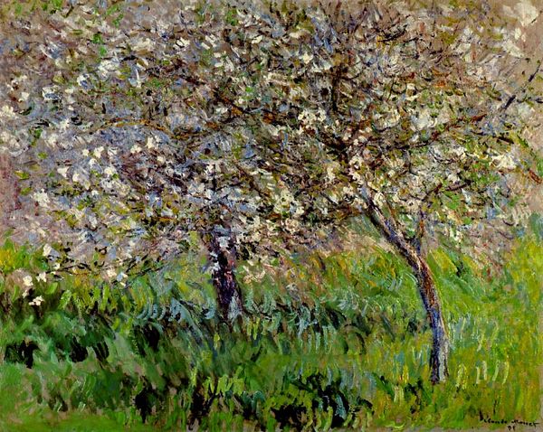Claude Monet’s "Apple Trees in Bloom" is a landscape painting that captures a fleeting moment in nature. The composition is structured by horizontal bands of colour and form. Notice how the land rises gently from the foreground, where the apple trees stand, to the horizon line. The sky, painted in soft blues, occupies the upper portion of the canvas. The structure offers a sense of depth and openness. Monet's brushstrokes are loose and visible, creating a sense of movement and capturing the transient effects of light and atmosphere. The flowers are rendered as dabs of paint, rather than detailed botanical studies. Monet emphasizes the sensory experience of being in nature over realistic representation. The painting destabilizes the traditional hierarchy between subject and background. The formal qualities invite us to reflect on the changing nature of perception and representation in modern art.