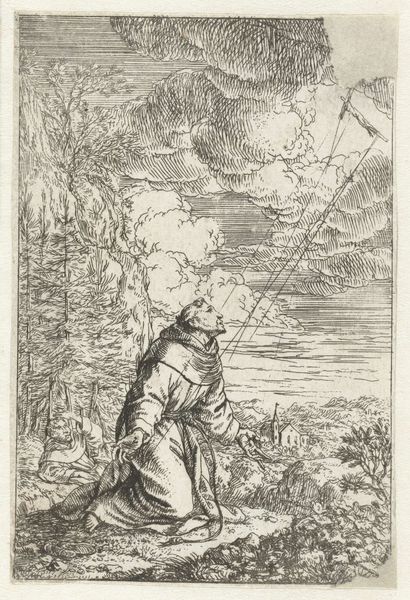 Curator: We’re standing before Reinier van Persijn’s engraving, "November: een jager met zijn buit," created in 1645. It currently resides here at the Rijksmuseum. Editor: It feels chilly just looking at it! The grayscale palette, of course, lends to the cold November feeling, but it’s the slouch of the hunter’s shoulders, the way he seems to be staring downwards, maybe regretting what he's done... I don't know. It’s rather somber. Curator: Note the deliberate use of line and shadow. The cross-hatching technique in areas like the hunter's fur hat and the foliage creates depth and texture, drawing the eye across the composition and imbuing the image with rich detail, and an almost tangible sense of realism despite being a print. Editor: Absolutely, and then that contrast works so beautifully with the smoother textures of the hunter's coat and the fur of the... bounty. See how the artist really allows the light to fall smoothly on those surfaces? Speaking of light, the overcast sky just bleeds perfectly into that sleepy landscape in the back. Beautiful. It almost romanticizes November's cold and drearyness. Curator: There is a striking balance between the foreground, dominated by the hunter and his game, and the background which consists of a village nestled in the valley. The contrast could possibly speak to the societal divisions and realities of life in 17th century Netherlands. Editor: A life and death thing. I didn't even think of that. Looking at that sweet pup so happy about it's master's success. Well. It is what it is, I suppose. This piece really encapsulates the harsh beauty of autumn. And isn't that the ultimate success of a landscape? Curator: It captures not just the visual landscape but also the cultural one, prompting consideration of how we view nature, its resources, and our relationship to it. Editor: Couldn't agree more. Let’s move on… to something less dead, perhaps?
