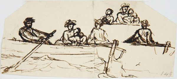 This drawing, "The Dinner in Boat", was created by Charles François Daubigny using pen and ink. The composition shows a scene on a river, dominated by horizontal lines suggesting water, contrasted by the vertical lines of the boat's cabin. This opposition of lines creates a structured yet fluid dynamic. Daubigny uses a semiotic system of marks, where swirling lines signify smoke and simple dashes denote birds. The figures, rendered with quick, gestural strokes, are less about individual portraiture and more about their function within the scene. The composition challenges traditional landscape art by focusing on everyday life. Notice how the drawing is not just a visual record but an exploration of form and line. The sketch destabilizes established meanings through its informal, immediate approach, prefiguring later modernist explorations of form over strict representation. "The Dinner in Boat" thus functions as a cultural sign, questioning traditional artistic values.
