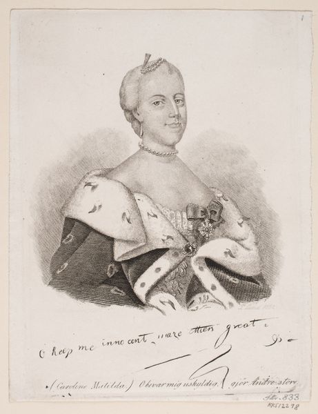 Curator: The weight of history, isn’t it fascinating? Look at all those symbols and medals bedecking this gentleman’s chest! Editor: Wow, that's... intense. Is this some sort of general? All those badges...makes him look like a decorated Christmas tree. Is this supposed to intimidate or impress? Curator: In fact, what we’re looking at here is Johann Baptist Clarot's 1840 engraving, a portrait of Adam Graf Reviczky von Revisnye. He wasn’t a general, though you are right to detect a military vibe. Reviczky was a prominent figure in Hungarian society and a member of the Habsburg court. Editor: Ah, makes sense! A bureaucrat, then, wearing his status on his sleeve. It's interesting how the Romantic era could glorify even the most…buttoned-up types, I guess. Curator: Well, this is not necessarily about glorification; instead, think of the layers of visual messaging being used. Medals and awards served as a powerful form of symbolic communication, especially when literacy rates were lower. It told you at a glance that this was a person of power, a loyal subject of the Habsburgs. Look closely – you can almost decipher his political allegiance and social standing just from these small metal objects. The sheer quantity suggests someone eager to demonstrate loyalty to the Empire. Editor: Point taken, Curator. There is more here than what meets the eye! All the same, it does leave me feeling a little suffocated… There’s something about the rigidity of it all – the tight collar, the severe gaze... It speaks to a very different time. Maybe it’s the limits on personal freedoms. How heavy would it feel? Curator: The symbolism certainly provides a framework for interpretation, doesn't it? This representation speaks to power structures, national identities and cultural values—consider that artists back then intentionally infused images with cultural, emotional, and psychological depth. It tells a different story each time we return to look. Editor: Right? It makes me want to deconstruct those symbols… Anyway, it really says something about power in that era. Glad it made you ponder on it!