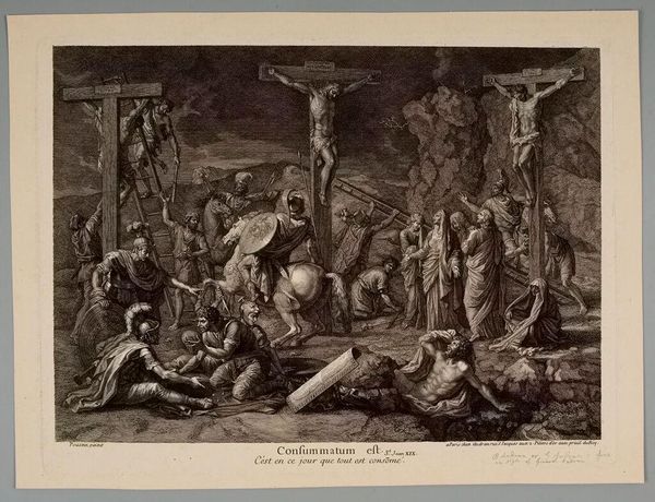 Curator: The immediate emotional impact of this piece is intense grief. The scene pulses with sorrow, doesn't it? Editor: Absolutely. What we're looking at here is "The Lamentation of Christ," an engraving made around 1730 by Bernard Picart. It's part of the Rijksmuseum's collection, rendered in a delicate linear style that seems characteristic of Baroque prints. Curator: Line work, indeed. The density of it creates a remarkable sense of shadow and depth, which truly heightens the drama. All those figures huddling around Christ… Who are they? Editor: The composition depicts the moments after Christ's crucifixion. We see the body of Christ being mourned by his followers and family—figures that have carried profound symbolic weight throughout centuries. Mary, of course, but also perhaps Mary Magdalene and other devoted followers. Curator: It feels charged, politically even. Lamentation scenes have, historically, offered a space to critique power structures and question injustices. Was Picart commenting on something broader, socially? Editor: Certainly. Given the context of the Enlightenment bubbling up across Europe, depicting religious scenes offered a potent, albeit veiled, commentary on human suffering and the fragility of earthly power. Religious symbols become almost like coded messages. Curator: And the use of engraving itself? Was that medium just a practical choice for distributing imagery widely, or was there something more to it? Engravings facilitated broader circulation of these emotionally potent scenes and therefore also the ideals they embody. Editor: Engraving, with its meticulous lines and capacity for detail, carries a certain authority, a sense of permanence. Think of the Bible illustrations, legal documents—engraving imbued images with veracity and reinforced its symbolic message. It becomes deeply embedded in the cultural memory. Curator: That layering of meaning across subject matter and technique creates such resonance. I'm struck again by the sheer number of figures. The individual grief seems almost absorbed into collective sorrow, amplifying it. Editor: Exactly. Picart masterfully uses visual symbols to portray the psychological weight of the moment and the broader context within history, embedding this image into collective memory. Curator: The intersection of the historical moment, religious symbolism, and the printmaking tradition allows us to interpret themes of faith, doubt, and social responsibility through art. Editor: A powerful convergence of art and symbolic cultural narrative indeed.