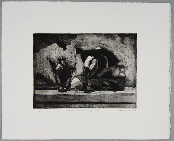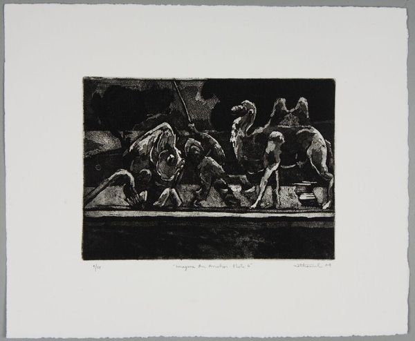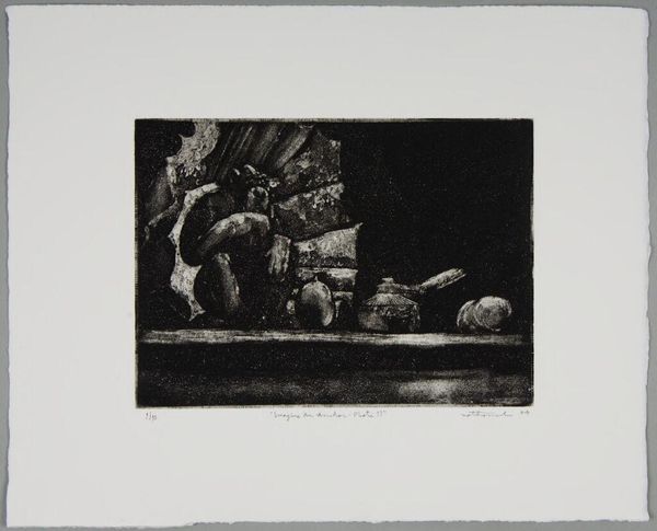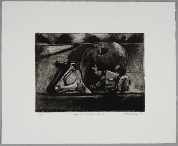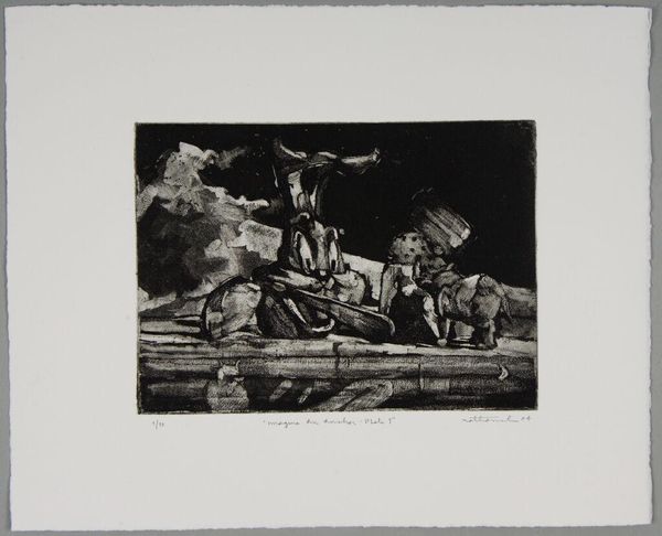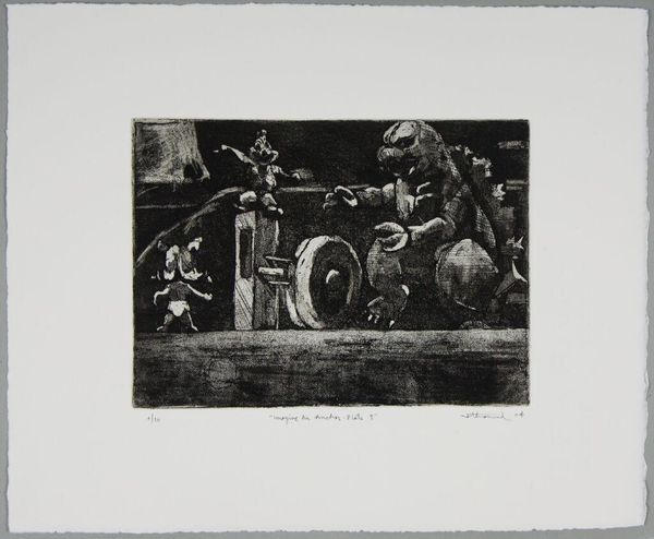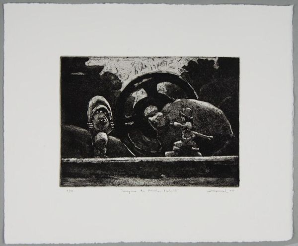 Editor: This is "Imagine an Anchor Plate 5" by Nathaniel Hester, a small print with no listed date. It's…somber. What do you see in this piece? Curator: I see a reflection on labor and companionship, perhaps commenting on economic precarity. Notice the worn gear alongside the dog; is this a statement on working-class solidarity, or a more complex commentary on the exploitation of both human and animal labor? Editor: Exploitation? That’s a heavy interpretation. Curator: Perhaps. But doesn't the title itself, "Imagine an Anchor Plate," invite us to consider the weight and constraints of societal structures? What anchors *us*? Editor: I guess I hadn’t thought about it that way. Thanks for the perspective! Curator: Of course! Art is a conversation, and it's always evolving.