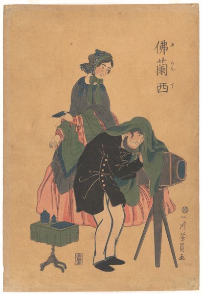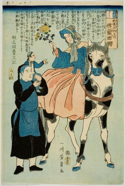 Curator: Right, let’s take a look at this striking woodblock print. It's entitled "France" by Utagawa Yoshikazu, and dates from sometime between 1850 and 1870. It’s part of the Metropolitan Museum of Art's collection here in New York. What’s your first take on it? Editor: My initial reaction is... disorienting, almost deliberately so. The perspective feels off, and the colour palette—muted yet clashing—creates a slightly uneasy feeling. The rendering of the figures is a little caricatured, a far cry from European naturalism. Curator: Precisely! That unease is part of its power, I think. These so-called Yokohama prints often depicted foreigners through a Japanese lens, processing what was then a fairly new encounter with the West after the opening of Japan. It’s interesting, the artist focuses heavily on this idea of "Frenchness" but what that even means becomes a question. Editor: You can certainly see the cultural filters at work. The woman on the horse, presumably "France" personified, appears in Western clothing but it’s a costume. And is that a groom next to her with his very distinctive hair? He seems unimpressed. Are there implied class differences or perhaps stereotypes being subtly highlighted here? Curator: Absolutely. The artist is working with received imagery and popular ideas, but imbuing it all with an inherent critique through his artistic choices. Look at the inclusion of that strange European script. Do you find yourself able to interpret this as an actual script? It looks like pure decoration. A surface veneer of the Western world that might even reflect a subtle level of distrust and distance. Editor: I hadn’t thought of that, but you’re right. It underscores the symbolic weight attached to the image of the ‘Westerner’ during that period. Curator: And yet, despite its satirical undertones perhaps, the print provides a fascinating window into a specific moment of cultural exchange and observation. Even these slight stylistic details have so much to tell us about power relations. Editor: It certainly complicates any simplistic notions we might have about a unified idea of 'globalization' in that period. This offers up so much complexity to consider about identity in flux. Thank you, I really wasn't expecting it to hit so hard!