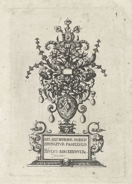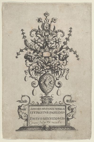 This print showing pendant designs with deities in niches and flower arabesques was made in Antwerp by Jan Collaert I in the late 16th century. It's an engraving, a medium that allowed for detailed replication and distribution of designs. The elaborate symmetry and interwoven patterns reflect the aesthetic values of the Northern Renaissance. Consider the social context: Antwerp was a booming center of trade and culture. This print reveals the importance of ornament and jewelry in expressing status and wealth. The inclusion of "CVM PRIVILEGIO" indicates a protected copyright, highlighting the emerging economic structures around artistic production at this time. It is an early engagement with intellectual property. To understand this work fully, we can consult inventories of jewelry from the period, guild records, and publications documenting design trends. Through such research, we appreciate how art is embedded in the social and institutional history of its time.