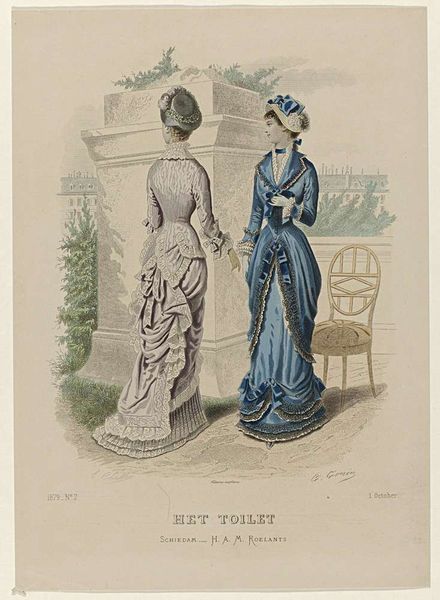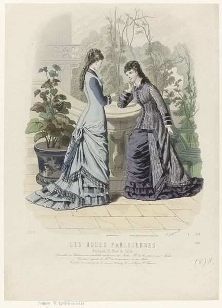 This fashion plate, titled "Les Modes Parisiennes," was made in 1878 by E. Bracquet. It is a print – a means of mass-producing images that became widespread at this time. Consider what's being represented here: not just fashionable dresses, but the *idea* of fashion, reproduced and circulated as a commodity. The image shows two women wearing elaborately designed dresses with multiple layers of fabric, trimmings, and embellishments; all created by skilled laborers. Each dress represents countless hours of work, from the weaving of textiles to the cutting, sewing, and finishing touches. The long train on the blue dress is impractical, speaking to the wearer's wealth and status. Note how these garments are presented as desirable objects, available for purchase. By understanding the labor and materials involved in their creation, and their circulation as printed images, we can better understand the social and economic contexts of fashion, and its relationship to industrial production and consumer culture.
