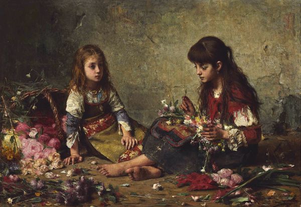 Alexei Harlamoff painted "Flower Girls" with oil on canvas and arranges its subjects in an intimate theatre of chiaroscuro. The painting captures three young girls amidst a vibrant array of blossoms; a composition that teeters between a staged tableau and a candid snapshot. The rough texture of the back wall contrasts with the delicate rendering of the girls' faces and the ephemeral quality of the flowers. Harlamoff masterfully uses light to sculpt form, casting the figures in a soft glow that accentuates their youth and innocence. Structurally, the work is divided into distinct zones of light and shadow, drawing the eye towards the central figures while obscuring the background. Semiotically, the flowers themselves serve as potent signifiers, evoking themes of beauty, transience, and the fleeting nature of childhood. This is reinforced by the figures and their gazes, each seemingly lost in their own world, creating a sense of detached observation.
