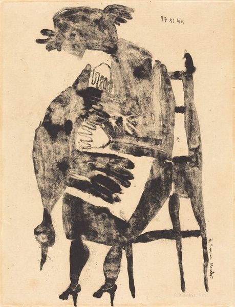 Max Pechstein made this print, Dancer, with lithographic ink on paper. The process here feels immediate, like the image has been pulled out of the ether, from the artist's imagination. I'm drawn to the way the blocky shapes come together, especially the dancer’s dress, which is also the dancer’s body. See how the inside edge of that shape also suggests her legs, and the feeling of movement? It's all so economical. Look at the texture, it’s not about perfection; the roughness in the marks gives it a raw, expressive energy. And how the colour palette is reduced to a few tones - ochre, black, cream - this creates a strong contrast and highlights the form. Pechstein, like other Expressionists, was inspired by printmaking and its graphic qualities, which is reminiscent of artists like Kirchner, but with a different vibe. Pechstein is more interested in form, and Kirchner in angst. This image stays with you - an invitation to dance along with it.