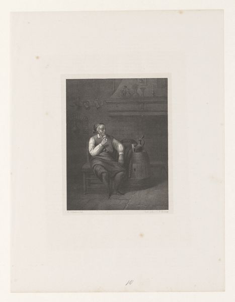 Joseph Edouard Van Looy created this drawing of a man, most likely with graphite on paper. The composition is striking in its stark simplicity: a seated man framed within a sharply defined rectangle that occupies a relatively small portion of the overall sheet. The drawing's structure is built upon a series of vertical and horizontal lines that define not only the figure's form but also the architectural space in which he is situated. Look closely, and you'll notice how Van Looy has employed varying densities of hatching to create a tonal range that is quite impressive. These tonal gradations give shape to the man's robes and features and hint at a sense of depth within the confined space. Consider the semiotic implications of the figure's posture. What does it mean when an individual is depicted with his head resting heavily in his hand, seemingly lost in thought? Van Looy presents us not just with an image but with a question about the relationship between the external world and the inner life.