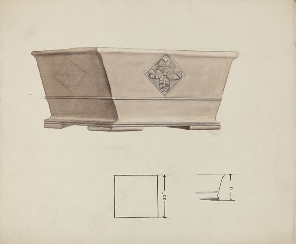 Curator: Let's turn our attention to this piece—a mixed-media drawing on paper by Henry Meyers, circa 1936, titled "Wine Cooler." It's deceptively simple at first glance. Editor: My initial thought is warmth, not exactly the cold associated with its title! The reddish-brown tones give it an inviting, almost cozy feel. I'm also struck by how precise and technical the drawing is. Curator: The drawing really speaks to the confluence of design and utility, particularly in the context of American domesticity during the 1930s. Wine, in a society stratified by Prohibition, then its repeal, signals a return to normalized social hierarchies. This object is complicit in these power structures. Editor: Absolutely, and examining Meyers' approach—using both drawing and mixed-media—we see a blend of industrial design with artisanal skill. It makes me wonder about the status of labor during the period. Is this object meant for mass production or bespoke creation, and what does the artistic process tell us about material access and class divisions? The dimensions sketched on the top confirm it as a plan of fabrication, rather than art per se. Curator: Yes, and note how the object’s purported function– cooling wine–serves a patriarchal social order in which women may be less directly invited into scenes of relaxation or alcoholic beverage. Is this meant for men? Is it meant to entertain the female gaze and to perform ease of use? These social codings need to be unpacked. Editor: It prompts thinking about labor—the person conceptualizing this wine cooler versus the people involved in sourcing materials and production. Were there other considerations: for example, trade agreements that shaped how this product was placed within the larger networks of consumerism. Curator: Right, by examining an object like this, we gain insight into material culture during this period, reflecting gender roles, power dynamics, and class distinctions prevalent during the Depression era. Editor: Definitely, thinking through this cooler gives way to the deeper workings behind daily, material existence. The artistry becomes clear through social and economic awareness.