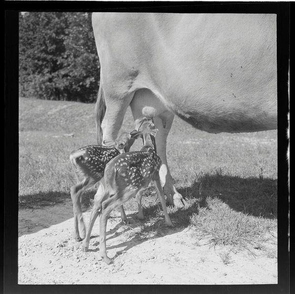 Curator: This evocative photograph by Jack Gould presents us with an unusual scene: baby fawns nursing from a cow. It's a small work, only about 6 x 6 cm. Editor: My first impression is one of vulnerability, but also of profound connection. This image challenges our assumptions about motherhood and species boundaries. Curator: The juxtaposition of deer and cow—wild and domestic—immediately brings to mind ancient myths of nurturing and transformation, a very old motif of interspecies fostering. Editor: Absolutely, and it highlights how "natural" behavior is shaped and defined by circumstance, raising questions about what we consider normal or acceptable in a world increasingly impacted by environmental changes. Curator: It leaves me pondering the universal need for maternal care, transcending these constructed boundaries. Editor: Yes, ultimately it prompts us to reflect on our responsibilities toward all living beings and the artificial constraints we've created.