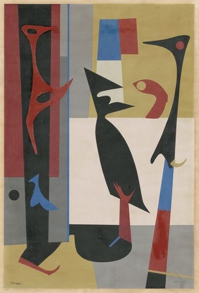 Curator: This is "Abstraction No. 1," a 1932 print by Louis K. Stone. Immediately, I’m struck by how this print manipulates its medium; you can see the texture, layering, and the precision achieved in its registration. Editor: My first impression is a sense of playful tension. The bright colors – the sky blue, red, yellow – coupled with the bold shapes, give it an almost mischievous energy. Curator: Indeed. And consider Stone’s choices in technique: printmaking wasn't just about reproduction, but also experimentation, even a kind of rebellion against the idea of art as a unique, untouchable object. By embracing industrial processes, Stone engages directly with the labor involved. Editor: That focus on labor really makes me consider who had access to making and owning art at the time. Who was this artwork for, and how did its geometric style speak to the socio-political landscape of the '30s? Curator: Well, geometrical abstraction itself can be read as a search for order amid chaos—reflecting perhaps the uncertainty that defined the Great Depression. Moreover, abstraction became aligned with ideas of progress and modernity in this period. Editor: The composition – the sharp angles alongside those more curvaceous shapes - suggest this search isn't just about harmony but about acknowledging conflict, that tension between form and fluidity. Curator: And in the making, you've got a meeting of minds and materials that challenges any fixed view on the hierarchies between the 'fine' and 'applied' arts. Editor: Right, and that pushes me to think of who was doing the "applying" of arts at the time: whose labour and whose voices remain less highlighted in narratives of art history and Modernism more broadly? How can art like this inspire us to reconsider social inequalities within art practices? Curator: It is precisely these social inequalities embedded within print production – mass consumption and so forth – that gives Stone’s "Abstraction No. 1" enduring relevance. Editor: Yes, examining how we engage with art, then and now, demands constant self-reflection. "Abstraction No. 1," serves not just as an aesthetic encounter but a potent reminder.