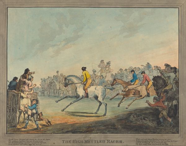 Editor: This is "Racing" by Thomas Rowlandson, created around 1812. It's a drawing and etching. The dynamism is remarkable; you can almost hear the thunder of hooves. What do you see when you look at it? Curator: Structurally, it presents a fascinating juxtaposition of linear precision and chaotic movement. Consider how the foreground horses are delineated with distinct outlines, sharp and purposeful. Yet, the background dissolves into a flurry of indistinct shapes and suggestive colors. This opposition, wouldn’t you agree, guides the eye? Editor: It does! Almost like the eye can't decide where to focus given there are so many groupings of figures. The composition feels very active and busy. What can you tell me about that, curator? Curator: Note the artist's calculated deployment of diagonal lines across the composition. This imbues the work with a vital sense of forward thrust and contributes fundamentally to the image's energy. How do you read the implications of that? Editor: Because all the jockeys seem like they’re surging toward a single point, toward progress, toward the future, perhaps? Is the coloring considered in this? The landscape is lovely and green but the coloring feels a bit flat, to me. Curator: The application of color, while subdued, contributes meaningfully. It serves not to replicate observed reality, but rather to heighten our awareness of form and spatial relationships. For example, observe the way the planes recede according to subtle changes in hue, which is essential in establishing the landscape. What does this imply to you? Editor: That Rowlandson is less interested in accurately portraying the event than in capturing its emotional and spatial effect, and emphasizing form through light washes. I’ve definitely gained a new appreciation for its subtleties. Curator: Indeed. It demonstrates how a keen observation of formal elements—line, color, composition—provides the surest path to comprehending any artwork's complexities.