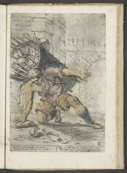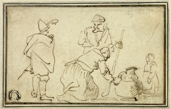 Editor: This is Hendrick Avercamp's "Small Sketch of Figures." It's quite small, almost miniature. I am intrigued by the figures; they are so simple, yet the artist has captured their essence. What strikes you most about its composition? Curator: Note the artist's deft employment of line, particularly in delineating the figures. Observe how the economy of means produces a sense of movement and the positioning of the figures implies a narrative despite the work's diminutive scale. Do you perceive any tension in the spatial relationships? Editor: I do see how the figures interact with each other, even without a detailed background. I see that this simplicity makes the composition very effective. Curator: Precisely. The artist’s skillful use of form and spatial arrangement serves to create a dynamic and engaging tableau. It's a testament to the power of formal elements in conveying meaning, regardless of size.