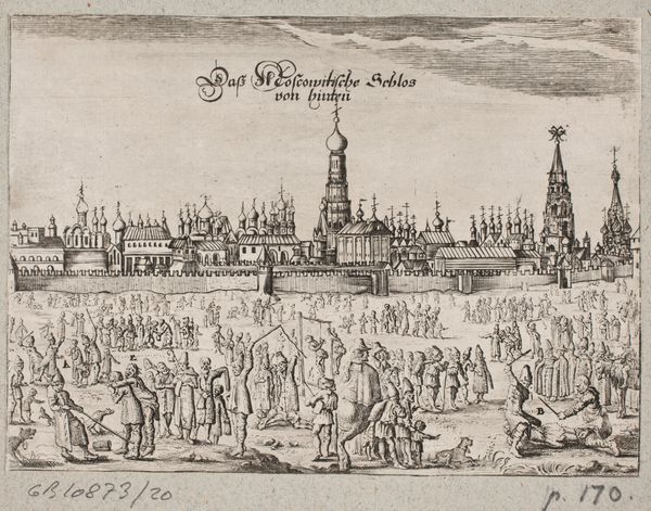 Christian Rothgiesser made this print of the Kremlin sometime in the 17th century. It is a product of the etching process, where lines are bitten into a metal plate using acid, then inked and printed. This technique allowed for relatively quick reproduction of images, contributing to a growing market for prints in Europe. The fine lines Rothgiesser achieved capture the architectural details of the Kremlin and the atmosphere of the crowded scene before it. Consider the labor involved; the skilled hand of the artist meticulously creating the image on the plate, and the work of the printer producing multiple copies. These prints circulated widely, carrying information and shaping perceptions of distant places. The image offers insights into early globalization, the movement of images, and the development of printmaking as a powerful medium. It is a testament to the significance of craft in shaping our understanding of the world.