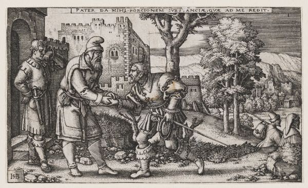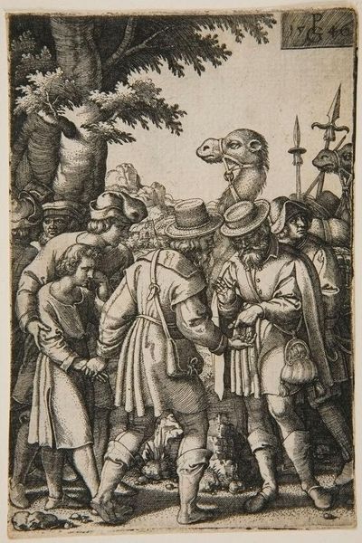 This anonymous print depicts the biblical story of Joseph being sold to merchants on their way to Egypt. The identities and status of the people involved are central to understanding this image. The merchants, rendered with detailed clothing and focused on counting their coins, represent a rising merchant class that was gaining prominence. Joseph, on the other hand, is depicted as vulnerable and powerless, a stark visual representation of enslavement. The contrast is palpable, isn't it? Consider how this scene reflects broader societal structures, where economic transactions often overshadowed human dignity. This print invites us to reflect on the historical context of trade and exploitation, urging us to consider the human cost of economic systems, and reflect on the power dynamics that allow such transactions to occur.
