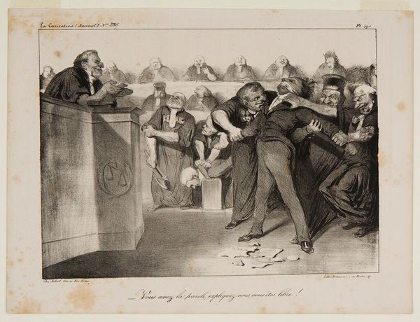 Curator: Welcome to this gallery featuring Honoré Daumier's compelling lithograph titled "Le Défenseur," created circa 1862-1865. Editor: It’s astonishing—the frantic energy emanating from the central figure is immediately arresting. I see raw emotion conveyed through hasty, almost violent lines. Curator: Indeed. Note how Daumier harnesses lithography to craft not just form but profound psychological insights. Consider the texture: the roughness of the stone imprints itself, a physical testament to the laborious process mirroring the lawyer’s zealous, arguably obsessive, defense. Editor: Yes, there’s a definite emphasis on production here, as well. The print medium allowed for distribution, a potent commentary perhaps on the accessibility, or lack thereof, to justice in Daumier’s era. It challenges notions of singular authorship—it's reproduced, shared, consumed. Curator: The semiotics are intriguing too. The dark robes contrasting the illuminated face denote authority yet simultaneously cloak vulnerability. The severe perspective throws the viewer into the auditorium’s pit, mirroring our complicity. The composition pulls focus using tonal contrast, structuring our view through layers of symbolic weight. Editor: Speaking of labor, beyond the immediate visual content, I am compelled to remember all hands involved from quarry to studio; from grinding pigment to preparing surfaces. We have not only Daumier but skilled craftspeople mediating expression via stone printing press and paper pulp transforming intent into a material object available within systems of distribution and access determined politically and socially. Curator: The genius is precisely how Daumier marries social commentary and formalism; look to how light functions! The beam isn't neutral illumination; it’s an interrogation. It casts long, distorted shadows –visual manifestation representing veiled moral complexities that lurk behind facades public service legal structures itself or even Daumier’s personal ambivalence towards what such defense means during his time within authoritarian systems when liberty often depended greatly upholding the law! Editor: By attending to both tangible materials along their associated networks while never failing keep sharp critique towards inequalities present the time; we gain so much depth from the artwork, wouldn’t you agree Curator: Absolutely! A perfect fusion formal rigor plus societal relevance creates something intensely moving but likewise prompting persistent introspection, perhaps urging all evaluate more clearly position respect with justice itself society broader scale.. Editor: Thank you! Appreciating this further pushes our lens onto examining materiality, labour production shaping both social discourse artistic boundaries too, perhaps providing grounds making real shifts inside world surrounds right after all viewing stops awhile time continues further.
