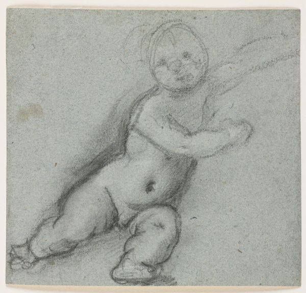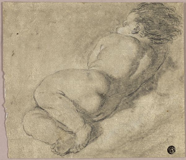 Curator: This is a drawing by Alessandro Casolani, likely created sometime during his active period in the late 16th century. It's entitled "Sketches of Two Putti, One Holding Hand of Dead Christ (recto); Torso and Legs of Kneeling Figure (verso)." Editor: It’s remarkably spare. Just these tentative figures sketched on a grey ground. There's a kind of subdued desperation communicated through the raw lines. Curator: Indeed. Note the artist's use of black chalk and charcoal, which provide a compelling range of tonal variation given the subject matter, as the medium complements the gravity. Observe, too, the somewhat academic yet stylized positioning of the figures; it creates a visual echo of Mannerist conventions. Editor: And the use of the putti in religious imagery. Considering the Reformation’s influence and the Counter-Reformation, how did artists negotiate religious sensitivities in their work at this time? It’s interesting seeing these classically influenced figures incorporated during periods of social change. Curator: The dynamic tension Casolani captures with line and shading is worth further consideration. Notice how the interplay between light and shadow suggests movement, enhancing the overall compositional weight, specifically on the kneeling figure, drawing the eye to the relationship with the lifeless form. Editor: Perhaps reflecting the Church’s complex stance toward reconciling classical forms and religious narratives? These artistic choices surely would impact the dissemination and reception of such works. What audience was Casolani intending to reach? Curator: This may very well have been a preparatory sketch, intended only for the artist’s personal development. Even without knowing its final purpose, we are afforded insights into both the subject of mourning and a snapshot of its impact within the visual vernacular. Editor: The power of historical sketches lies in this very intersection. They represent the personal creative processes and wider cultural dialogues shaping visual language. Curator: It’s precisely through considering Casolani's treatment of form and the emotive weight of this simple yet affecting rendering of devotion that we are invited to perceive not only historical style but the artistic practice in dialogue with its era. Editor: A testament to how visual study can elucidate an artist's approach and his place within the broader artistic conversations. Thank you for your insight!