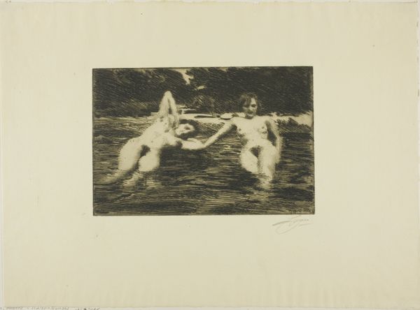 Anders Zorn made this etching, "The Ford," with ink on paper. I find it really interesting how the simple act of mark-making can create a whole world. Zorn’s strokes feel immediate, like he’s capturing a fleeting moment. The texture, created by these tiny, deliberate lines, gives depth to what could be a flat surface. I'm drawn to the contrast between the dark, dense foliage and the shimmering water, achieved by the lightest touch. Look at how he renders the figure's back, with those quick, confident lines. It's an interesting dance of light and shadow, making the form feel solid yet ephemeral. There's a touch of Whistler in the subject matter of nudes in nature, but Zorn's style feels more visceral, less precious. Art is like a conversation between artists across time, each riffing on the themes of the past, but in their own language. It's up to you to interpret it, to let it mean whatever it means to you.