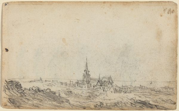 Editor: This is Jan van Goyen's "Panorama," a landscape drawing created around 1650, using chalk and graphite on paper. There's a real stillness to it; the limited use of line and tone makes the scene feel quiet, even vast. What stands out to you when you look at this drawing? Curator: Quiet and vast, yes, precisely. I see Van Goyen capturing something essentially Dutch: the sky. It’s practically infinite here, isn’t it? The land is just a sliver, a place for a little church steeple, but the heavens…they’re where the drama is. I always imagine him sketching outdoors, quickly, trying to grab that fleeting light before it vanished. Don’t you get that sense, that immediacy? Editor: Definitely. It feels like a fleeting moment captured in time. But it’s almost *too* simple, isn’t it? Is there something deeper than just a quick sketch of a landscape? Curator: Perhaps the ‘simplicity’ is the genius! It's an intimate glimpse into a specific time and place, of course, but for me, it evokes a more expansive emotional landscape. It speaks of the sublime--that sense of awe and insignificance we feel in the face of nature's grandeur. The light becomes a character in itself; hopeful but somewhat desolate, what do you make of that? Editor: It’s true, the muted light does create a specific mood. I hadn’t considered the 'sublime' aspect before. Now I'm thinking about how Dutch landscape paintings helped shape national identity, especially their obsession with depicting and draining every last bit of land to create more landscape and agricultural land. The landscape is essentially a product of cultural and technological forces and social conditions that make their way into art… I wonder if the land, for them, served as a metaphor of a world of infinite possibilities. Curator: Beautifully put! Precisely! Van Goyen offers not just a picturesque view, but a reflection of humanity's relationship with its environment and perhaps a kind of deep yearning. Editor: That's a very thought-provoking idea; it gives a deeper dimension to what initially appeared to be a simple sketch.