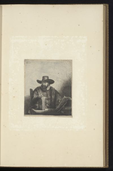 Curator: The portrait before us, “Portret van een man met platte hoed bij een tafel,” presents a sitter in striking attire, dating back to somewhere between 1855 and 1880. It's a gelatin silver print. What are your initial thoughts? Editor: There's a peculiar formality to the pose—the arms crossed, the patterned trousers—almost defiant. It hints at a certain social positioning, perhaps striving for respectability. Curator: Indeed. That outfit makes an outsized statement, doesn’t it? I imagine he knew that. This image operates on cultural memory; the clothing signifies so much about class aspirations and cultural values during the mid-19th century. The flattened hat in itself communicates a unique fashion choice for the period. Editor: Precisely. The hat does mark him as part of that fashionable culture; its visibility would have influenced reception greatly, shaping the sitter's identity in very immediate terms. Did the photographer intentionally choose this setup for its socio-political resonances? Curator: It is difficult to discern what was deliberate choice by the photographer or by the sitter himself. We often forget these historical sitters had choices, or were asked for them. This all makes for a symbolic representation loaded with cues, that we may even only see bits of today. I keep pondering the table to the right. What does it say? It serves both as a class marker and as a psychological barrier. Editor: Yes, that staging reinforces societal structure! It highlights a striving towards bourgeoise sensibility in a society experiencing seismic shifts due to industrialisation, no? Consider the relationship between portraiture, individual agency and propaganda... how that might play out! Curator: Excellent consideration, that. So much is implied within a relatively still moment. The vintage style in itself lends such atmosphere, I find! The toned paper and evident ageing contribute towards its charm, but it does leave the work slightly vulnerable to over-romanticising. Editor: Vulnerability feels intrinsic, actually, both in its aging state and in the man’s careful self-presentation before the camera lens, caught within the changing mores of his era. That in itself holds power! Curator: True. An artifact preserving those critical negotiations between expectation, image, and identity in the social landscape of the time. I am more interested in understanding why, of all possessions, he wanted that little table in the image? Editor: Ah, more mysteries to ponder, indeed!