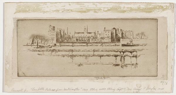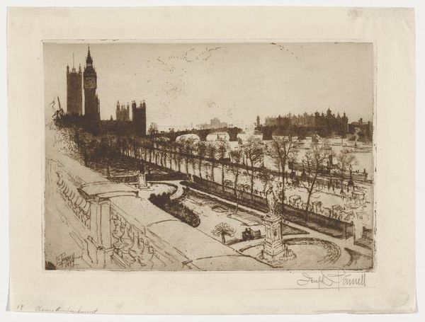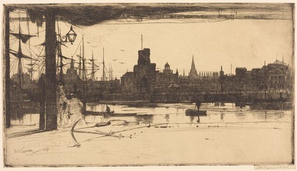 David Young Cameron’s etching, titled 'Houses of Parliament', offers a study in contrasts, created with drypoint. At first glance, one is struck by the sheer verticality and density of the Parliament buildings on the right, a formidable mass rendered with a web of fine, dark lines. In stark contrast, the left side opens up to a panoramic view across the Thames, with the bridge providing a horizontal counterpoint. This division creates a semiotic dialogue between power, represented by the solid architecture, and fluidity, suggested by the water and open sky. The meticulous detail of the buildings contrasts with the lighter touch used for the bridge, emphasizing their symbolic weight. The texture is also key; Cameron’s cross-hatching creates a palpable sense of depth and shadow, which invites viewers to consider the artwork not just as a scene, but as a statement about permanence and change, authority and liberty.