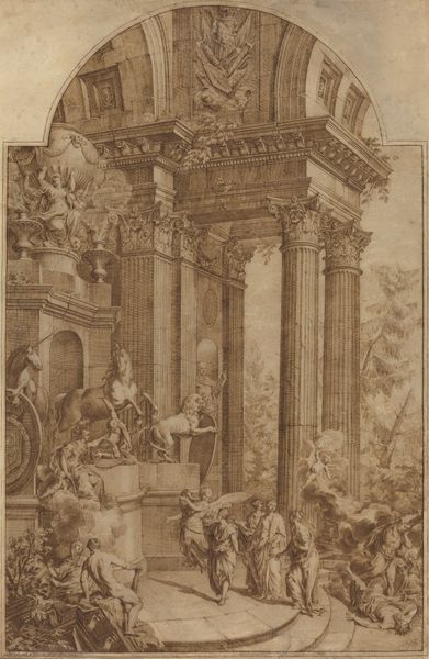 Hubert Robert sketched the Temple of Vespasian in brown ink, a scene where grandeur crumbles into picturesque ruin. Observe the Corinthian columns, laden with acanthus leaves, a motif echoing the vitality of nature and the aspiration toward the heavens. This architectural vocabulary, conceived by the Greeks and perfected by the Romans, speaks of order and civilization. Note how this design is echoed in the Renaissance and beyond, symbolizing a rebirth of classical ideals. But here, the ruin speaks volumes. The broken pediment and the scattered stones tell a tale of time's relentless march, a memento mori reminding us of the transience of human achievement. This juxtaposition of aspiration and decay engages our subconscious, stirring a deep, often unsettling contemplation of mortality. The classical symbol then becomes a fragment of a bygone era. Thus, Robert captures not just a temple, but a powerful meditation on history, memory, and the cyclical nature of human endeavor.