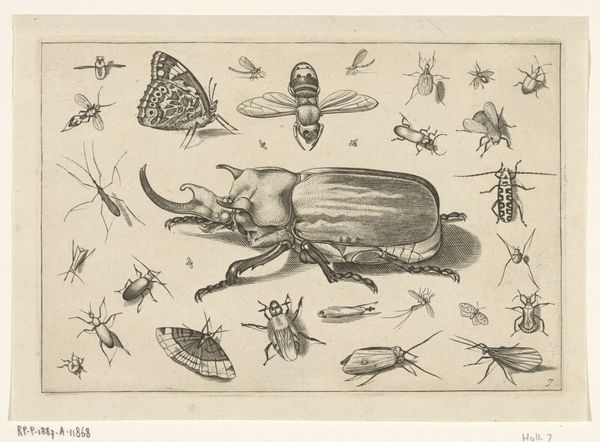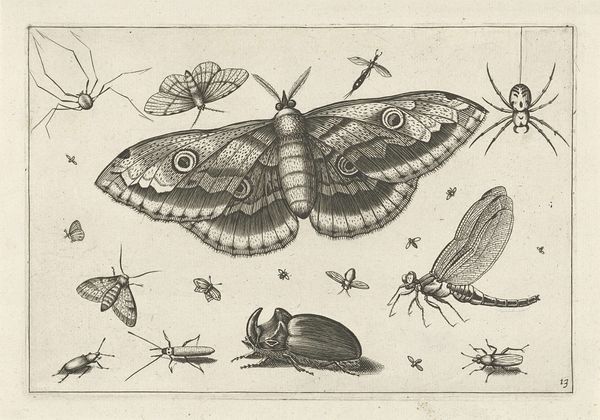 Curator: Looking at "Insecten," created around 1630 by Jacob Hoefnagel, what immediately strikes you about this pen, ink, and engraving artwork? Editor: I'm immediately struck by the detail and precision. It feels like a scientific illustration, almost like a collection of specimens laid out for study. There's a clinical quality that separates us from nature's vibrancy. Curator: Yes, the historical context here is crucial. The 17th century was a period of burgeoning scientific exploration, where the natural world was classified, dissected, and visually documented in service of European power structures. "Insecten" must be viewed within the power structures that were emerging, especially pertaining to trade and access to nature’s material wealth. Editor: So, this isn’t simply about observation; it's also about power and possession? I see your point. Even the materials—the ink, paper, and engraving tools—speak to that process of controlled replication. What was accessible? Who owned these objects in the context of emerging capitalism and European empires? Curator: Precisely. Insects, sourced globally and visually preserved as if trophies of European "exploration," came to be presented disembodied from both ecological webs of relationality and the labour involved in their procurement. Hoefnagel was working within an era of shifting material dynamics where the labour practices of obtaining these specimen have come to be replaced by capital’s fetishization of ownership. Editor: And what of the craft? How did Hoefnagel’s specific process impact our reading of the piece? There’s undeniable skill at play here – look at the chitinous sheen rendered by the pen work on the beetles, or the implied delicacy of the butterfly wings. Curator: I believe his training further enabled certain values such as observation and careful collection to solidify themselves within broader culture, setting standards for “objective” natural representation as a service for further ecological degradation in colonized regions of the world. Editor: It’s fascinating to consider that what may seem like a neutral, scientific rendering holds this loaded historical and economic framework. Thinking about art as evidence really alters my interpretation here. Curator: Exactly. And recognizing this artwork within broader intersectional narratives encourages dialogue concerning ongoing colonial practices evident today, so considering that, how has your perception evolved? Editor: It feels less like a record of natural curiosity and more like a symptom of our own history with the environment. Thanks for reshaping how I'll understand not only art from this era, but even approaching what counts as "empirical evidence."