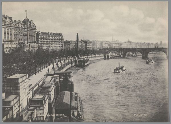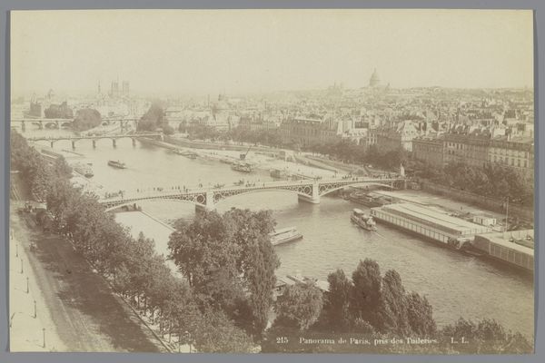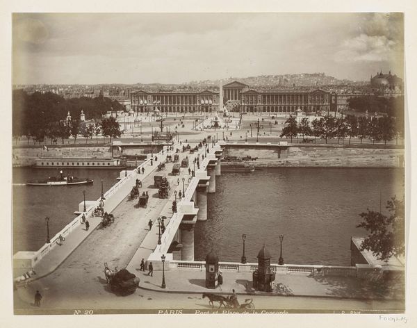 Curator: This is a photograph titled “Pont des Arts en het Institut de France, Parijs,” believed to have been captured between 1887 and 1900, authorship attributed to someone only known as X. Phot. Editor: The immediate feeling I get is wistful. It’s as though a moment in time has been beautifully embalmed in sepia tones. There’s a density of bodies traversing the bridge, and that beautiful, stoic building watching over it all... Curator: The image is a gelatin silver print, placing it within a period of photographic history when that process was becoming dominant for its clarity and reproducibility. It seems mass production of images became possible like never before. Look closely at how the light interacts with the Seine, and reflects back upwards! Editor: That interaction between the light, the water and the man-made…it’s magnetic! I wonder about all of these little moments that comprise city life at this time in Paris. Curator: One might consider the socio-economic implications of readily available images of this burgeoning metropolitan space. The industrial revolution is here and what it means to visualize place through affordable artwork accessible to anyone with means, no matter the background. Editor: Right! It pulls you into that narrative. The bustling bridge teeming with tiny figures all journeying towards something... and, beyond them, the impressive building, promising answers. It's poetic, isn’t it? Do you feel a bit seduced? Curator: Seduced? Perhaps. But it’s also about thinking how it flattens the city. Or better: represents urbanism and capital in a very manageable form, creating something portable but very potent for widespread consumption. Editor: Oh, the dance between art and social construct is an intoxicating one. I can’t resist the melancholy of the image, imagining the artist wandering the city on that afternoon! Curator: So, whether read through sentimental impression, or an analysis of production processes, images like this offer enduring appeal. Editor: Absolutely. We take what resonates and leave the rest for another time!