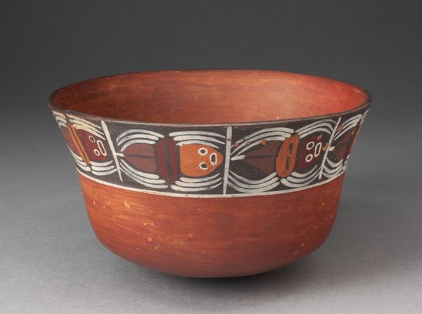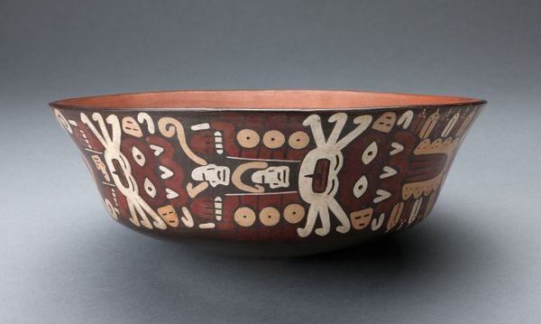 This ceramic bowl, depicting anthropomorphic sharks, was created by the Nazca people. Note the predominantly reddish-brown hue, enveloping the vessel and setting a warm, earthy tone. Observe how the abstract figures of sharks are not merely representational but are stylized through sinuous white lines, filled with angular shapes and sharp edges. The artist uses a semiotic language, where the shark isn't just an animal, but a symbol. Consider the bowl's function – it would have been used for rituals and daily life. The design suggests a world where humans and nature are intertwined, where a shark takes on a human-like form, blurring the lines of identity. It's not just about what is depicted, but how: the structure, the color, the lines. These all come together to present a world where the boundaries are ever shifting. The bowl isn't just a container; it's a narrative, a dialogue between form and function, challenging our perceptions.