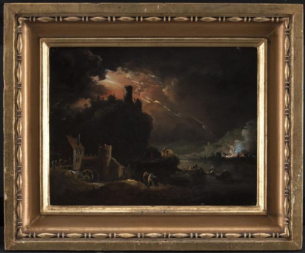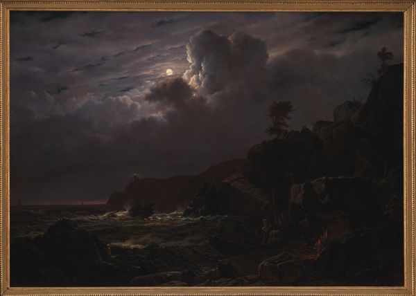 Editor: Here we have Andreas Achenbach’s "Transport after a storm in Porto Venere in the gulf of Spezia," painted in 1857. It's an oil painting with a dramatic scene of people in boats amidst stormy waves, contrasted against a glowing sunset. It feels very romantic and… well, overwhelming. What strikes you about it? Curator: What I see here, beyond the Romantic drama, is a deliberate construction of a public image. Achenbach isn’t simply recording a storm; he’s participating in the 19th century’s fascination with the sublime power of nature and humanity's struggle against it. This wasn't just a picturesque scene, but a representation of the power and fury of the landscape over mankind, carefully composed to appeal to a specific kind of national and cultural identity. Notice how small the figures in the boats are relative to the vastness of the sea. Where do you think that places humanity in terms of nature’s control? Editor: Good point! They do look quite small and at the mercy of the storm. Is it making a statement about the vulnerability of humanity, then? Curator: In a way, yes, but also about resilience. Paintings like these also catered to the burgeoning middle class, eager to display their cultural sophistication and understanding of grand historical and natural themes. Remember that owning art was a status symbol; this piece spoke to notions of national pride, perhaps of naval strength tested by nature. Do you get a sense of narrative from this painting? Does it feel like a captured moment in history to you? Editor: It does have a grand, historical feeling to it, beyond just a pretty landscape. I see now how it's more than just a painting of a storm; it’s a painting *about* something much bigger. I never considered the class dimension before! Curator: Exactly. Art like this was performing cultural work, reinforcing certain ideas about nationhood, heroism, and the relationship between humanity and the natural world within a very specific socio-economic context. Editor: That’s a perspective I hadn’t fully appreciated before. I’m going to look at these dramatic landscapes in a completely different way now!