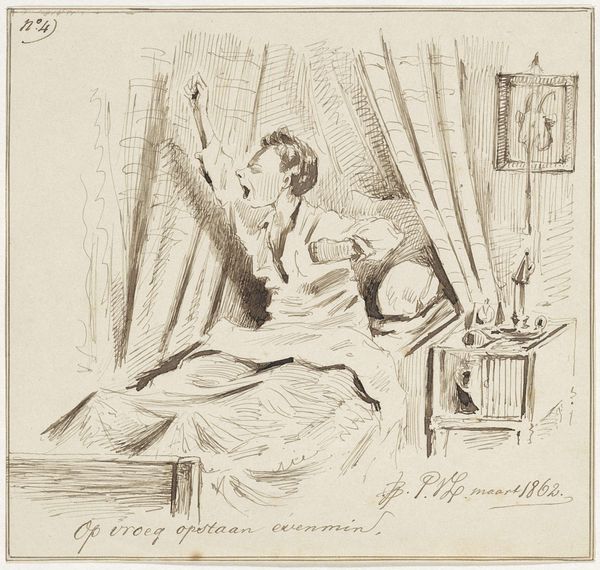 Pieter van Loon made this ink drawing in 1862. It's titled "Verhaal van de jongen Jantje, nr. 7," which translates to "The Story of the Boy Johnny, No. 7." The image depicts a man, presumably the governor, in a lavishly decorated room. There's a globe, books, and what appears to be a gown hanging in the background. The text accompanying the drawing suggests a satirical commentary on the governor's character and his relationships. The mention of deceit, greed, and stupidity indicates a critique of the governor's moral standing. Van Loon made this during a time of significant social and political change in the Netherlands, with growing liberal movements challenging conservative norms. It seems to reflect broader social anxieties about leadership and morality. To understand it better, we can research the political figures of the time and the social commentary prevalent in Dutch art and literature. The meaning of art is always tied to its social and institutional context.