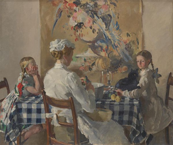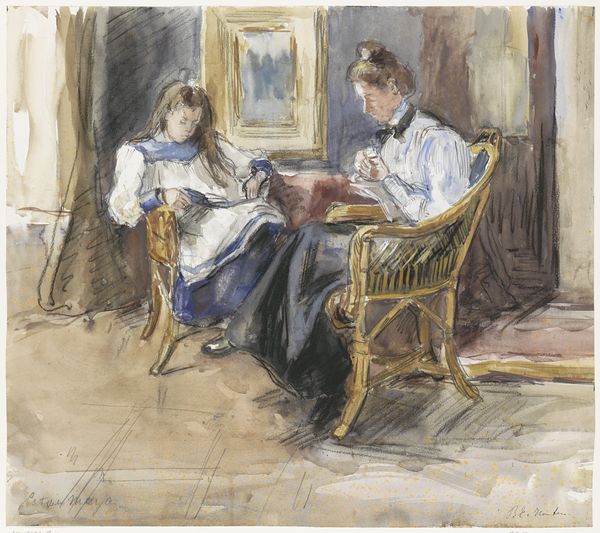 Curator: This watercolor, "Two Young Women Writing and Sewing in an Interior at Hatton, Warwickshire", brings to life a private world. The artwork’s estimated creation date is between 1820 and 1830. Editor: Yes, and what immediately strikes me is the quiet intimacy. There’s something almost dreamlike about the light and how it pools around the figures, creating a very distinct mood. Curator: It’s interesting you say that. The play of light here establishes a formal geometry – see how the table anchors the composition with its stable horizontality, and the figures create verticals that lead the eye upwards? The space is rendered with subtle tones of watercolor washes. Editor: Right, but that geometry also subtly reinforces a very specific social positioning. These are women engaged in domestic, intellectual pursuits. The interior becomes a stage upon which gendered roles are enacted and observed. The paintings that adorn the walls, what sort of family narratives are being told there? Curator: Notice the artist has paid considerable attention to texture, particularly in the rendering of the fabric. The crinoline sleeves of the sewing woman contrast starkly with the flat planes of the table, setting up contrasting rhythms. Editor: Exactly, a rhythm of labour and leisure, but it also prompts questions about accessibility and privilege during the period of British Romanticism. How does this representation intersect with prevailing societal views? And is this accurate given the work in the image? Curator: That’s a valid point. I read here the Romantic period and it's quiet introspection within this composition. Editor: It makes me reflect upon the societal constraints versus the pursuit of inner cultivation, particularly for women, in the 19th century. Curator: The delicate handling of watercolor medium really suits the sense of delicate interiority on display here. Editor: Agreed. Viewing through a lens of social history helps to reveal layers beyond the immediately visible.