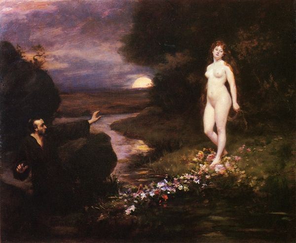 Editor: This painting, titled "The Bathers," is by Pierre Puvis de Chavannes, done with tempera and gouache. It evokes such a serene, almost melancholic mood. What do you see in this piece? Curator: This work is steeped in the symbolism of its time, a visual echo of societal anxieties surrounding women and their bodies. Note how these figures are placed in a liminal space, neither fully natural nor traditionally classical. How does their ambiguous placement make you feel, especially considering the context of the late 19th century and its restrictive roles for women? Editor: It feels staged, almost theatrical. Their poses seem…deliberate. Curator: Precisely. This deliberate artificiality clashes with the supposed naturalness of the nude form, drawing attention to the male gaze inherent in its representation. Do you think it challenges or reinforces this gaze, and how? Consider how their lack of engagement with each other intensifies that gaze onto them. Editor: I guess it does reinforce it by not really offering any alternative viewpoint. Curator: Indeed. These women are passive figures in a landscape, seemingly unaware of their own vulnerability. This speaks volumes about the limitations placed upon women during that period and, in some ways, persists today. It provokes questions about autonomy, objectification, and the enduring power dynamics within artistic representation. Editor: I see that now, especially in the gaze of the seated figure, directed upwards, as if anticipating judgment. Thanks for opening my eyes to that. Curator: My pleasure. It’s through this critical lens that we can start to understand how art both reflects and shapes our understanding of social issues.