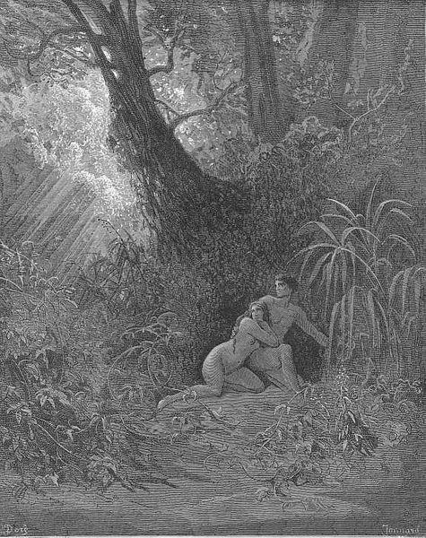 Curator: Gustave Doré’s engraving, “So parted they…the Angel up to Heaven From the thick shade, and Adam to his bower,” presents quite a poignant moment, wouldn’t you agree? Editor: It’s strikingly melancholic. The light seems to drain away with the departing angel, leaving Adam and Eve in almost desolate shadows. It's dramatic! Curator: The stark black and white emphasizes the sense of loss and the shift in their world. Consider the Victorian era's fascination with Milton's Paradise Lost. Doré's commercial illustrations, mass-produced as engravings, made high art accessible. Editor: The details in the engraving are mind-blowing, given it's all lines, no colors at all! Did he do this freehand, or did they have some other methods? I am thinking that a tool and a surface were used, along with his mastery, to reach this kind of outcome. The tonal range feels so expressive... like a whispered secret. Curator: The cross-hatching technique would’ve demanded meticulous labor. Doré understood the marketplace: an artistic commodity for middle-class consumption. We cannot separate its artistry from its industrialized origins. Editor: Okay, but setting that aside, isn't there something heartrending about their postures? The way Adam seems to be shielding Eve. What is she feeling here? Curator: Certainly, Doré captured their vulnerability after the expulsion. Their nakedness underscores that sense of exposure and the social expectations of modesty at the time of production and consumption. Editor: Absolutely. Maybe this engraving taps into that lingering awareness we have as humans - how society always wants you to dress, to do, to be... Maybe these engravings were subversive reminders that there could have been a before to this time. Curator: A moment of utopian speculation embedded within industrial production. How curious! Editor: Yes, it is like we are now spectators, but what exactly are we watching? Curator: Well, this reflection reminds me that our engagement with an image reshapes its meaning. Doré's engraving becomes, itself, a commodity through interpretation, which I believe only makes its afterlife richer.