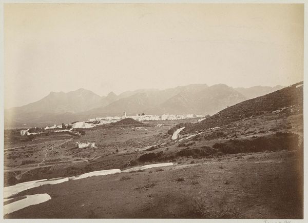 Curator: Bourne’s sepia-toned photograph captures the weight and the weariness of the Fort of Tughluqabad, near Delhi. It's a place burdened by its past, wouldn't you say? Editor: Absolutely. There’s a haunted stillness to it. Look at those crumbling stone walls, the way the light seems to drain from them. It feels less like a fortress and more like a graveyard of ambition. Curator: Well, Bourne, working in the late 19th century, often presented such colonial landscapes as both monumental and melancholic. The fort, for him, was a ruin that symbolized power, both present and lost. Editor: It's fascinating how photography can freeze a moment, yet still suggest such profound narratives about the rise and fall of empires, the silent stories etched into every weathered stone. Curator: Indeed. It's a testament to the enduring human desire to leave a mark, even when time wears all things down. Editor: A rather poignant reminder that even the mightiest structures can be humbled by the relentless march of history.