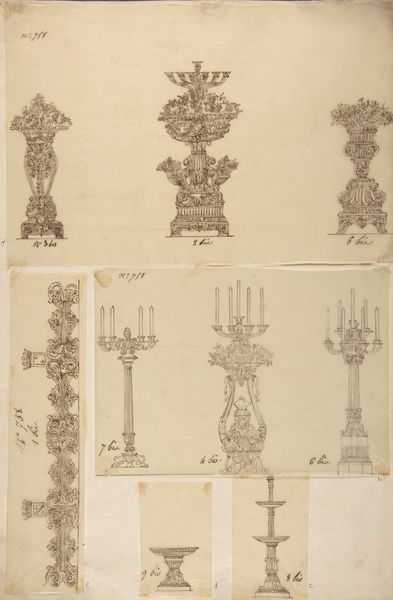 Editor: We're looking at a print titled "Designs for Four Candle Fixtures," from the 19th century, artist unknown. It's rendered in ink, showcasing decorative art. The visual that pops out at me are the serially presented candelabra designs, so classic and...refined! What can you tell us about this image? Curator: This print provides a glimpse into the 19th-century world of decorative arts and design production. Consider the role prints played at the time. Were these designs meant for mass production? For dissemination of style? Or as a sample book for prospective clients? The inclusion of numbering – '1025', '1036' – indicates perhaps their indexing within a broader catalogue. How do you think these factors influence our understanding? Editor: That’s a fascinating point – I hadn't considered the commercial function of art! It does look like a catalog page now that you mention it. Why would it be important for designers to produce something like this? Curator: Precisely! In the 19th century, the rise of industrialization and consumer culture demanded readily available designs. These prints offered a way to standardize taste, dictate trends, and allow for replication, playing a crucial role in the development of mass culture and the democratisation, in some respects, of design. What do you think about this tension between artistry and commerce? Editor: It is interesting to think about democratizing art, I suppose creating some opportunity and expectation of it for many in the public through commerce is still better than the elite keeping the "best" art for themselves. This makes me think about how tastes get made or invented and promoted in service of culture and commerce together. Thanks, this has me seeing a very common image, in a new light! Curator: Exactly. By understanding these designs as products of specific socio-economic forces, we gain a richer perspective on the intersection of art, industry, and the shaping of public taste. We might ask who benefits from a particular public taste.