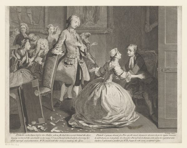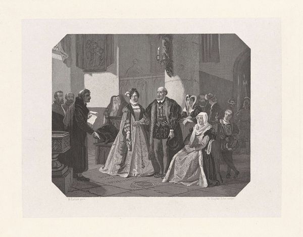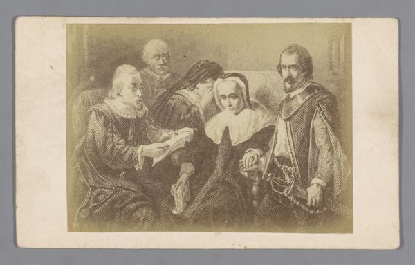 Editor: This is a reproduction of "The Signing of the Death Warrant of Lady Jane Grey" by Daniel Huntington, dating from around 1870-1900. It looks like a photographic reproduction of a drawing, possibly an etching or engraving? The scene is heavy, full of tension... What do you see in this piece from a more formal perspective? Curator: What strikes me immediately is the strategic composition. The figures are arranged in a shallow, almost stage-like space. Observe how Huntington uses a restricted palette, relying primarily on tonal variations to create depth and to direct the viewer’s eye. Notice the textural contrasts as well; the smooth planes of Jane's gown, the fur trim on the king’s robe. Where does your eye linger, and why? Editor: I'm drawn to the contrast between Jane's bright dress and the darker clothing of the men surrounding her, especially the executioner looming in the background. I also notice the man who's taking Lady Jane Grey’s hand… what is his role here? Curator: Indeed. Consider the implications of this focal point. The strong horizontal created by the table, intersects with the powerful diagonals generated by the positioning of the standing figures, with the verticality of Lady Jane’s seating position: does this evoke the painting's narrative of the subject as ‘cornered’? Also, reflect on the overall effect created by the tonal contrasts and sharp linear details. Editor: The composition definitely creates a feeling of Lady Jane Grey being caught between powers outside of her control. All this focus on contrasts creates a kind of... imbalance. But I'm curious, since it’s a photographic reproduction, does the analysis change? Curator: The photographic reproduction necessarily flattens the nuances of the original drawing, slightly altering its structure. Though its intrinsic composition and values hold as true, our relationship as a viewer shifts based on its context. Ultimately it acts as a reference to the original work which impacts interpretation. Editor: I never thought of the difference that a photographic reproduction would create. I'll look at reproductions in a new way from now on! Curator: And I shall reflect on our relationship as a viewer, and continue to evolve on the power of visual pieces within distinct periods.