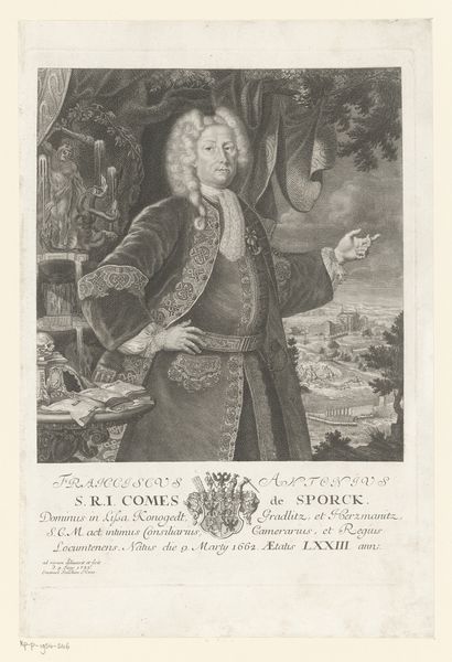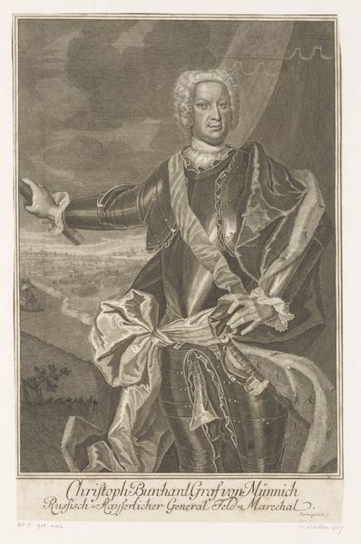 This is Martin Bernigeroth’s portrait of Johann Wilhelm von Sachsen-Gotha, made with engraving techniques. The structure of this print compels us to examine its dualities: between the man and his status, the individual and his context. Bernigeroth uses stark contrasts to define Johann Wilhelm, positioning him in full armor against a backdrop of battle and aristocratic regalia. This contrast is not merely decorative; it’s a semiotic system. The armor symbolizes power, while the distant battle infers external challenges. Look closely at the aristocratic symbols to the lower left and right of the portrait. What underlying messages do you think these symbols portray to the contemporary viewer? This portrait is a complex interplay of personal identity and structural representation, which asks us to consider how individuals are framed by the powers they embody and the historical forces that shape them. It challenges our reading, suggesting that identity is not fixed but is actively constructed through visual signs and cultural narratives.