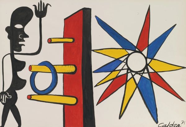 Curator: This vibrantly colored acrylic painting is "Ubu," completed by Alexander Calder in 1971. Its collection of geometric forms, buoyant in composition, exemplify Calder's playfulness during his late career. Editor: It strikes me immediately as joyous and cartoonish. The shapes are so simple, almost like stencils a child would use, but there's an underlying symbolic language. Curator: Indeed. Calder had been deeply engaged with theatrical design, particularly Alfred Jarry's "Ubu Roi," an absurdist play satirizing power. Given that, one might interpret the forms as characters or elements from this play rendered in a delightfully flattened space. The rise of the Pop Art movement influenced Calder’s aesthetic vocabulary at this point, impacting both the formal arrangements and the selected imagery. Editor: The Yin-Yang symbol juxtaposed with the cartoonish moon – is Calder hinting at dualities, perhaps a cosmic dance of opposing forces? Also, the red “T” structure and stacked circles possess an almost totemic presence. I wonder if it evokes the idea of primal archetypes, like mother, father and child. Curator: That's an interesting reading. During this era, the art world grappled with questions around institutional power and accessibility, with pop art emerging as a rebellion against established norms. In Calder's context, creating seemingly childlike works can itself be seen as a way to challenge the authority inherent in established art circles. Editor: Absolutely. The power of this simplicity makes one recall ancient pictograms and sigils. Look at the spiky star form! With this almost unconscious or shared recognition, it’s as if the painting allows for the rediscovery of universal meaning in rudimentary geometric representations. Curator: Ultimately, “Ubu,” in its own lighthearted way, represents how even established artists like Calder responded to—and commented on—the evolving art world in the later twentieth century. Editor: The composition and use of simple yet symbolically powerful shapes creates a piece that operates both on a visual and subconscious level. I feel the painting evokes something primordial within the modern, and invites contemplation on cultural history in an engaging manner.