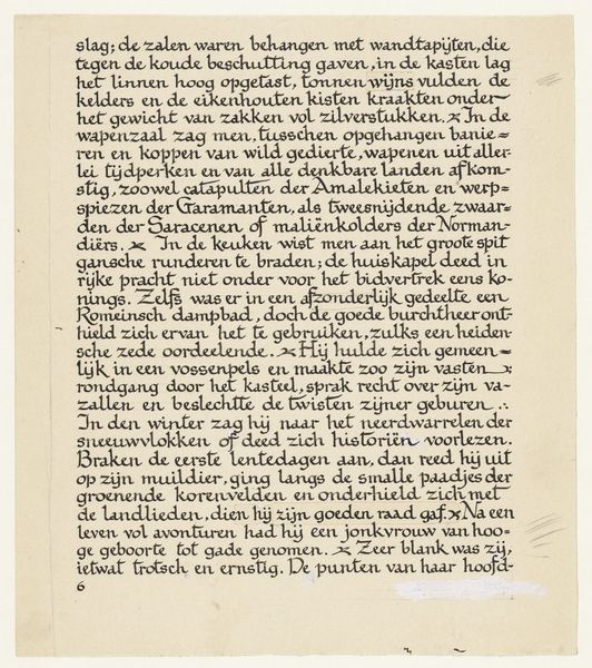Curator: So, we have before us Carel Adolph Lion Cachet’s "Inleiding met ornamentrand voor Onder Neerlands vlag," a typography piece from 1899. What strikes you most about it? Editor: The Art Nouveau floral designs surrounding the text are quite striking. And yet the text itself speaks to military institutions; that feels like an interesting juxtaposition. What can you tell me about this particular work? Curator: Indeed. The tension between decorative aesthetics and military content is crucial. We see Art Nouveau, which often embodies progressive social ideals, framing a text about the Dutch Military Bond and loyalty to the Queen. We need to ask: what social function might this have served in the Netherlands at the turn of the century? Do you see a nationalist impulse at play here? Editor: I think so. The language is very patriotic, celebrating Dutch military history and devotion to the monarchy. But is it also about anxieties concerning national identity and colonial power? Curator: Exactly! This poster wasn’t created in a vacuum. In 1899, the Netherlands was consolidating its colonial grip on Indonesia. Art like this can reinforce and normalize that power structure at home, making military service and allegiance to the crown seem natural and desirable. What do you think the stylized border adds to that message? Editor: The swirling lines feel almost like tendrils, suggesting that loyalty to the crown is natural or even organic. It's interesting how such an aesthetic choice can contribute to the overall message about national identity and imperial power. Curator: Precisely. The style itself becomes a tool for solidifying ideological values, highlighting how deeply entwined aesthetics and politics can be. Editor: This has given me a completely different perspective on Art Nouveau! Curator: And on the many subtle ways that art participates in cultural narratives of power and belonging.
