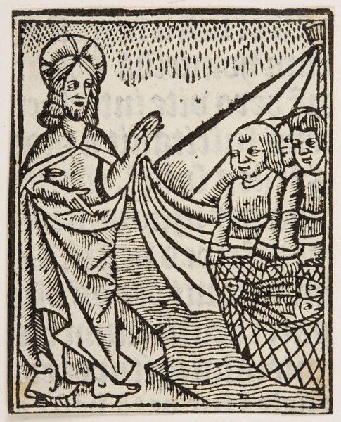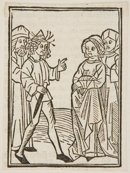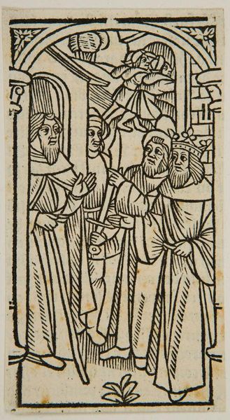 Editor: This intriguing woodcut, titled "Jacob and Esau?", artist unknown, presents a scene of submission or potential violence. I'm struck by the stark contrast between the figures. What can you tell me about the historical context or the social forces at play here? Curator: Well, what do you notice about the figures' attire, their postures, and the symbols of power present? This image reflects a hierarchical society where authority, often divinely sanctioned, is visually reinforced. These images functioned as a tool for social control, didn’t they? Editor: Yes, I see that now. It's fascinating how art can be both a reflection and a shaper of social power. Thanks for sharing your expertise! Curator: My pleasure. It’s essential to remember that art is not created in a vacuum but within complex networks of power and meaning.