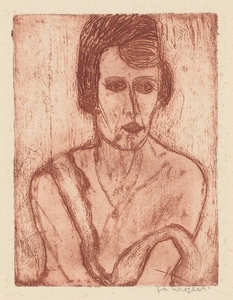 Curator: Good morning, let’s consider Kazimir Malevich’s 1933 oil painting, simply titled "Smith." Editor: Haunting. My immediate impression is of a stern, almost spectral figure emerging from darkness. There's something quite unsettling about it. Curator: The composition uses contrasting areas of light and shadow to give the figure dimensionality, a direct reference to classical figuration. But given the Soviet context, "Smith" raises pertinent questions about the artist’s position. Malevich attempts to synthesize avant-garde aesthetics with socialist realism to create a portrait of the ideal Soviet worker. Editor: Idealized? Really? Look at his expression – his raised eyebrow, the set of his mouth. The hand gesture strikes me as defensive, even suspicious. I'm getting anything *but* a sense of optimism. Was he wary of depicting such an idealized representation given Stalinist artistic mandates? Curator: It's a fascinating tension. Notice the muted palette and visible brushstrokes. They evoke a sense of authenticity, while also suggesting a painterly engagement that surpasses mere propaganda. The red garment, possibly a worker’s uniform, adds a subtle visual element that seems… intentional in its restraint. Editor: Restraint? Maybe a veil for subversion. Consider Malevich's fraught relationship with the regime. Having pioneered abstract forms with suprematism, he had to perform a sharp U-turn back to figurative work in order to survive within the dominant cultural system. Curator: This work, then, can be seen as an example of how personal aesthetic expression negotiates politically restrictive context. Editor: Precisely. A powerful example of what happens when the radical aspirations of art collide with the iron fist of ideology. An artist’s career—his life even—hung in the balance, demanding a compromise that may appear docile but reveals an incisive cultural criticism when one knows how to see. Curator: Indeed, our focus on form, texture, and coloration is incomplete without acknowledging these complexities of "Smith." It's about seeing how aesthetics and society influence one another. Editor: Right. A reminder that art isn't created in a vacuum, but reflects larger political and ideological currents and the negotiations the artists have to consider when creating work that represents the individual's view of the whole society.
