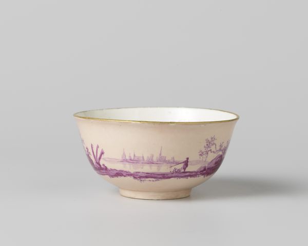 Editor: This is part of a coffee and tea service crafted between 1774 and 1778 in Loosdrecht. It's ceramic, and the decorations are delicately rendered in a lilac hue. I find it charmingly quaint, but the somewhat monochrome palette feels a bit limiting. What formal elements stand out to you? Curator: Immediately, I note the elegant simplicity of its form. Observe the careful balance between the rounded bowl and the small foot, creating a harmonious relationship between stability and lightness. The smooth surface serves as a canvas for the painted landscape, drawn using delicate strokes that exemplify the Rococo penchant for asymmetry and ornamentation. Do you notice the strategic placement of the painted scene in relation to the blank space? Editor: Yes, there's a definite contrast between the detailed, miniature landscapes and the unadorned porcelain. Almost like a cameo effect. The landscape is diminutive in scale, particularly considering the relative plainness and size of the bowl itself. Curator: Precisely. The composition directs the eye around the form, encouraging a contemplative appreciation. Note the sinuous lines that define the hills and trees. Consider how these forms interplay with the curvature of the ceramic itself. There's a fascinating dialogue between surface and decoration, wouldn’t you agree? Editor: I do! The gentle curve of the bowl definitely complements the painted landscapes. And focusing on the formal elements highlights the artistry in its simplicity. Curator: Indeed, it encourages us to appreciate the aesthetic qualities beyond mere function, elevating the object to the realm of art. A synthesis of form, decoration, and intent. Editor: I never would have noticed that without you pointing it out. I’m walking away with a deeper appreciation for ceramics!