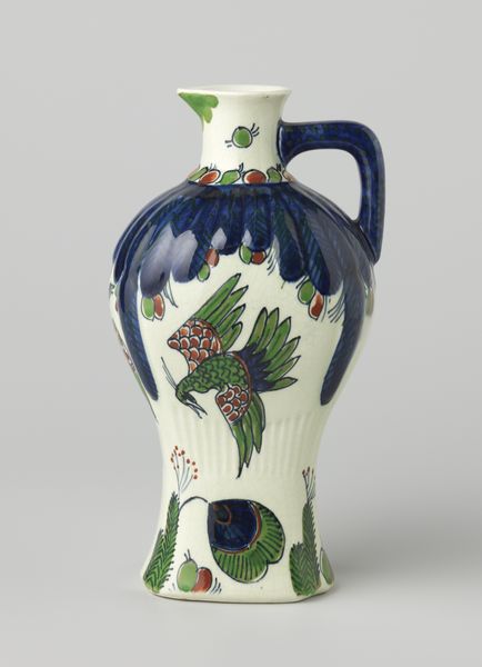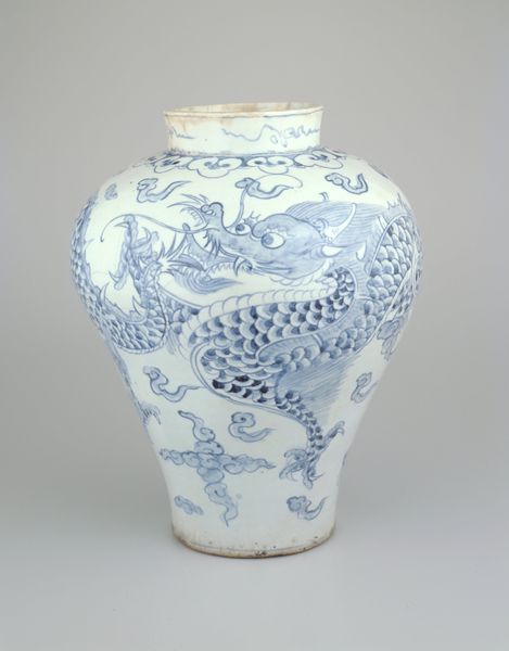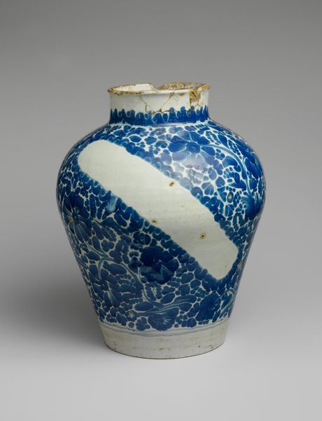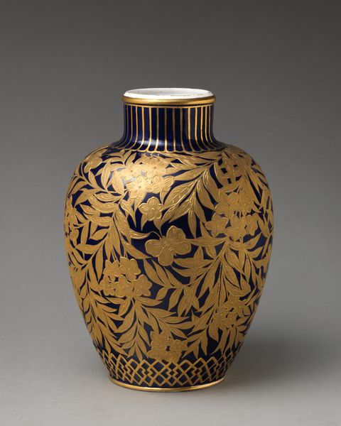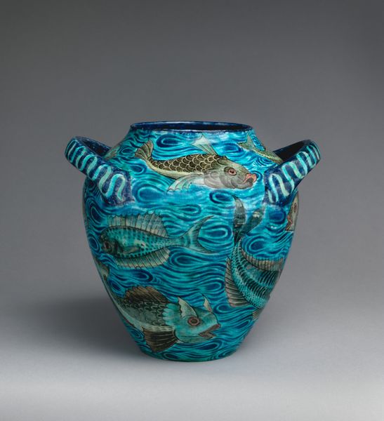 Editor: Standing here in front of "Vase," created in 1902 by Newcomb Pottery, crafted from ceramic and earthenware, I'm struck by the sense of tranquility it evokes. It reminds me of a quiet pond on a summer afternoon. The blues are so calming. What do you see in this piece? Curator: It whispers to me of twilight gardens and fireflies! The way those lotus blossoms and leaves are rendered—it's pure Art Nouveau poetry. Think about the Arts and Crafts movement brewing at the time. People were yearning for handcrafted beauty, pushing back against mass-produced… stuff. And this vase embodies that longing, doesn’t it? A unique, handcrafted object, imbued with a kind of spiritual connection to nature. Doesn't it feel like a bit of a dream itself, spun from clay and light? Editor: Absolutely, the dreamlike quality is undeniable. And the lotus motif... I guess they were pretty popular back then? Curator: More than popular, darling! Think of the lotus flower itself: emerging from murky waters to bloom in pristine beauty. It’s a symbol of purity, rebirth, enlightenment—a universal image that resonates across cultures. To me, its inclusion suggests a narrative about hope. It's about finding beauty even in difficult circumstances. This particular rendering makes it feel… American. There’s an almost folksy directness, wouldn't you agree? Editor: It does! I never thought of it that way. I was too caught up in just thinking it was a pretty vase. Curator: That's perfectly alright. A work of art doesn't demand our approval or understanding, it requests a moment of genuine presence in an experience. What will you do with it? Editor: It's inspiring to consider how cultural movements and symbolism intertwine. I'll try to remind myself to stay present, while considering a work’s story. Thanks! Curator: The pleasure was entirely mine, my dear! Never underestimate the power of a ‘pretty vase’ to hold a universe of stories.