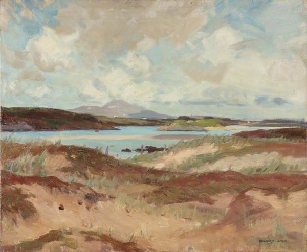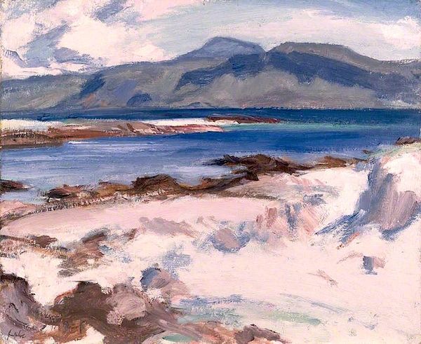 Editor: So, this is Samuel Peploe's "Ben More from Martyrs Bay, Iona," painted in 1925. It’s an oil painting, and the colours feel… almost dreamlike? It's not how I'd expect a landscape to look. What stands out to you in this piece? Curator: What I see is Peploe engaging with a visual dialogue that's been shaped by, among other things, the rise of tourism and the romanticisation of the Scottish Highlands. Think about how the Highlands were marketed – both visually and textually – and how Peploe's contemporaries represented these same scenes. Is he playing into that, or pushing back? And what role does painting en plein air play in the production and later reception of an artwork such as this? Editor: That's a great point. It’s interesting to think about the role of painting en plein air here. Do you think painting outside and engaging directly with his environment affects what ends up on the canvas? Curator: Absolutely. Painting 'en plein air', directly from nature, changes everything. It connects him to Impressionism and its legacy, which emphasizes direct observation. Yet, Peploe simplifies forms and amplifies colours, moving away from purely representational painting towards a modernist, individual vision of the Scottish landscape. And consider where and when these paintings might have been shown - in private collections or public galleries - and to whom? This shapes our understanding of them. Editor: It's like he's inviting the viewer to experience the place, but filtered through his unique artistic perspective. I guess, because I saw dreamlike quality when the intention might have been to capture a feeling, or even be affected by commercial pressures... I wouldn't have noticed any of this without you. Curator: Exactly. He is both observing *and* interpreting. It's a wonderful example of how an artwork participates in various visual, social, and historical dialogues at the same time. Editor: That's incredibly insightful. It gives me a lot to think about.