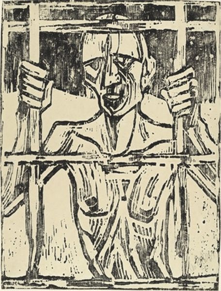 Editor: Christian Rohlfs' "The Prisoner," a linocut from 1918... It’s heavy, dark. The rough-hewn lines almost scream off the paper. What strikes me is the raw emotion, like a howl trapped in ink. How do you interpret such a visceral piece? Curator: Visceral is spot on! I imagine Rohlfs staring intensely, willing the story from the block itself. The starkness amplifies the figure's anguish, doesn't it? Look at the barred lines; they’re more than just prison bars, aren’t they? They're slashing, trapping marks that speak to a deeper confinement, almost… existential. Perhaps it reflects the anxieties of post-war Germany, wouldn't you agree? What do you make of his gaze? Editor: It's wild. It feels like defiance, terror, maybe even a glimmer of madness. It's not passive at all. But if those bars are more than just literal, where does that take us? Curator: It shatters the picture plane, it is almost daring the viewer to engage with the very real distress of isolation – isolation imposed by war, trauma, society, or even self. I’m fascinated by Rohlfs' ability to convey that with such elemental technique. Editor: It definitely hits harder knowing it was made in 1918. It makes you wonder what specific experience, personal or observed, fueled this… outburst? Curator: Indeed. The linocut’s very nature – bold cuts, uncompromising lines – serves the urgency of expression so brilliantly. What have you found most compelling? Editor: The ambiguity. Is he broken or unbroken? That tension makes the image burn itself into your mind. Thanks, I'm really looking forward to researching Rohlfs in depth this semester. Curator: Precisely! The questions are more vital than any answers offered. It sounds as though that internal burning that we can both imagine and recognize so readily, it gives meaning and motivation. That is art’s truest function!