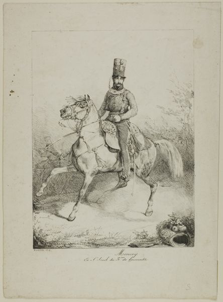 This is a portrait of Jean-Baptiste Kléber, made by Charles Gavard. The engraving presents a formal composition, dominated by the figure of Kléber and his horse. The light is subtly managed to highlight Kléber’s face and uniform, drawing our attention to the details of his military attire. The sword, held casually, adds a diagonal line that disrupts the otherwise rigid verticality of the composition. This contrast suggests a tension between the formality of rank and the implied action of military life. Gavard masterfully uses the medium to create gradations of tone, giving depth and texture to the figures. This careful arrangement and modulation of light and shadow function semantically, constructing a narrative of power and authority. The portrait is not merely representational, it's a study in contrasts, revealing how the interplay of line and form can speak to broader themes of leadership and the complexities of identity.