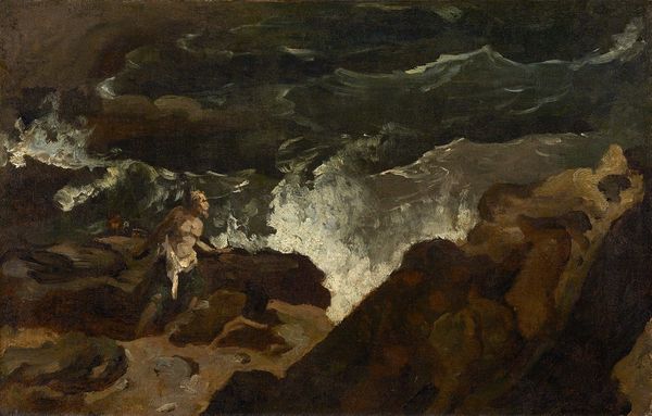 Curator: Goya’s "Brigand Stripping a Woman," created around 1800, certainly presents a stark vision, doesn’t it? Editor: Absolutely. My first impression is one of palpable dread. The almost monochromatic palette heightens the drama, pushing the narrative to the forefront. Curator: Indeed. Goya painted this during a time of immense social upheaval. It reflects the violence and insecurity that were becoming rampant, particularly experienced by women in times of war. It also illustrates how the art world often focuses on conflict and disruption as political signifiers of change. Editor: The woman's vulnerability is so potent; her body becomes a battleground, symbolizing broader societal struggles and patriarchal violations. The composition, especially the dramatic use of chiaroscuro, reminds me of feminist writings on the objectification of the female form. Is her identity fully extinguished to emphasize that role as symbolic vessel? Curator: Exactly. Think about how paintings like these were circulated and viewed at the time. The private collections where works like this would reside acted almost like political clubs—elite spaces where opinions were formed. Editor: Right. It’s interesting how Goya, known for his courtly portraits, could also turn his gaze toward such brutal scenes. Is it a critique of power, or perhaps, in some way, a reflection of its inherent violence? Curator: Perhaps both? The painting uses history as a dark mirror, reflecting uncomfortable truths about humanity, class, and, as you noted, deeply entrenched power structures. The politics of imagery serve to shape our perception of not only women, but also social values of that era. Editor: I see Goya’s painting less as a historical document and more as an allegory of human cruelty. His commentary is on systemic injustice. The image evokes parallels in contemporary scenarios: marginalized people, gender-based crimes, economic disparities... sadly timeless, isn't it? Curator: Timeless in its subject matter, certainly. As art historians, examining these visual texts offers unique windows onto both the past and ourselves, doesn't it? Editor: Indeed. It serves as an invitation, even a demand, to continue reflecting on the role and impact of art in our societies.